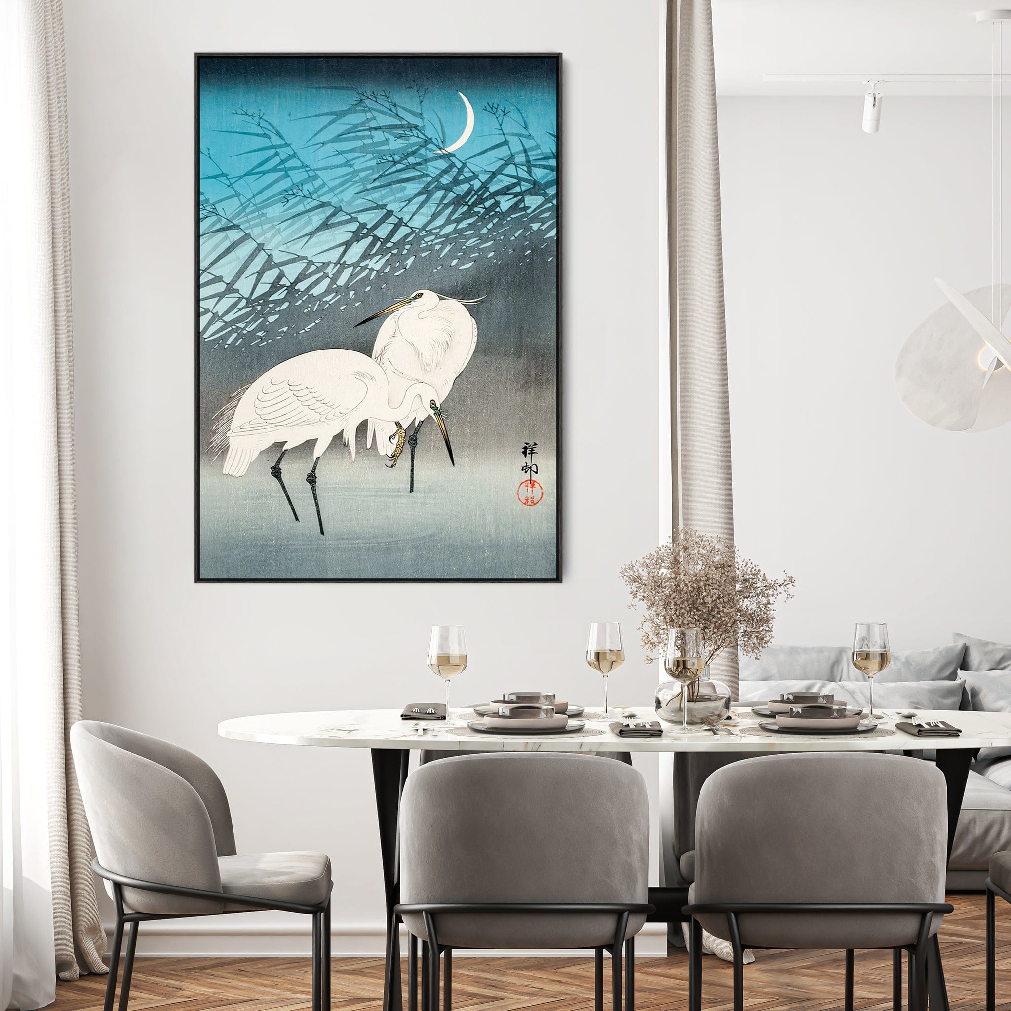 Large Japanese Wall Art Framed Ohara Koson Canvas Print of Egrets in Reeds Painting