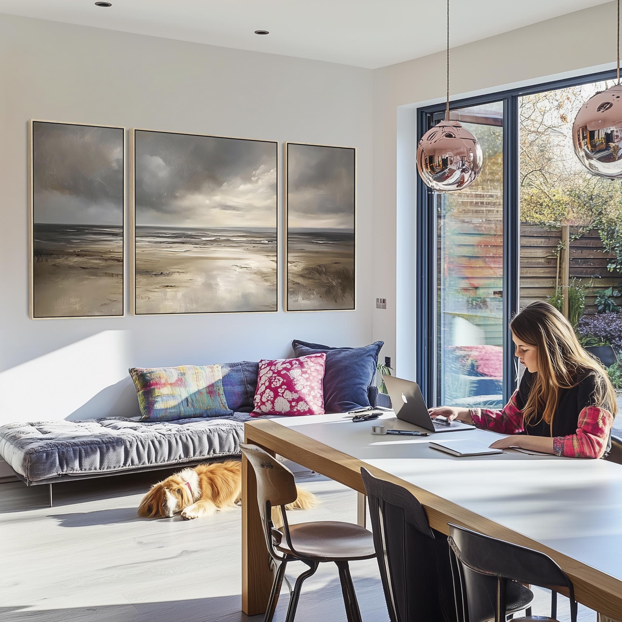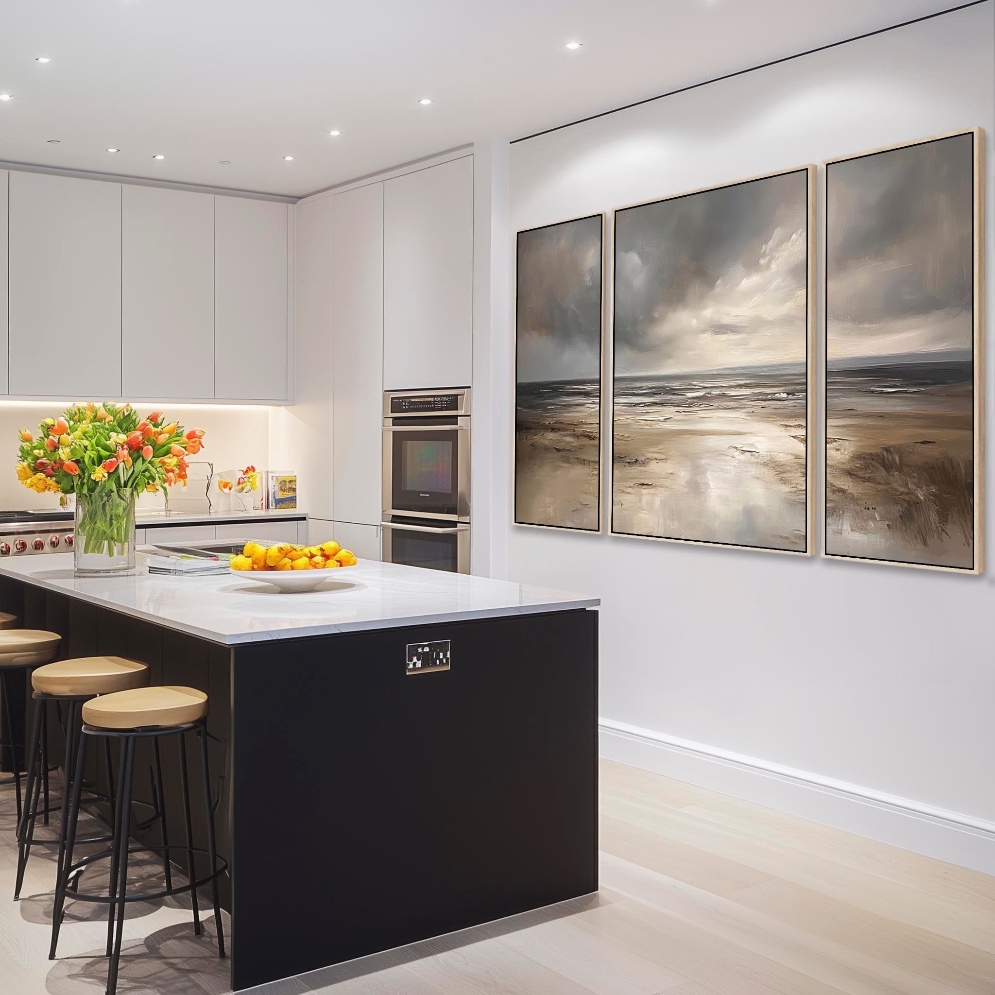 Discover abstract and landscape art in rich grey and neutral tones with a bold set of 3 style, framed in a neutral frame. Each detail adds depth, transforming your space into a story told through colour, light, and texture.