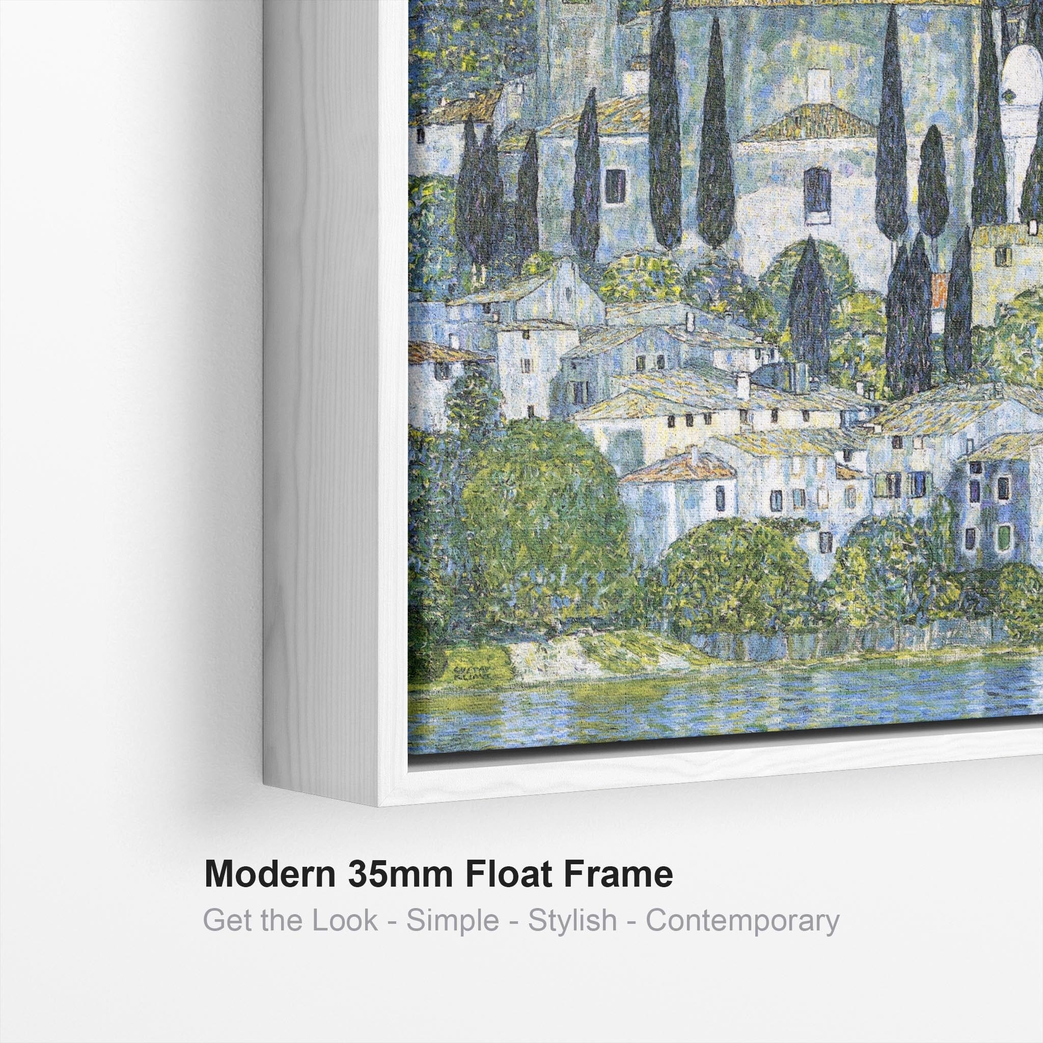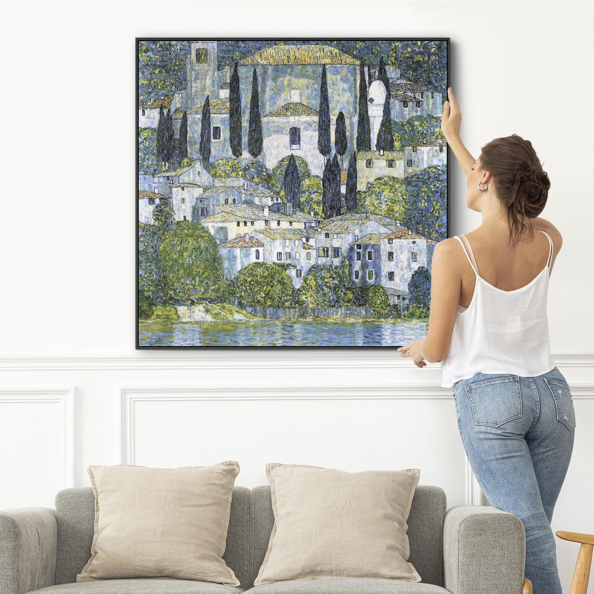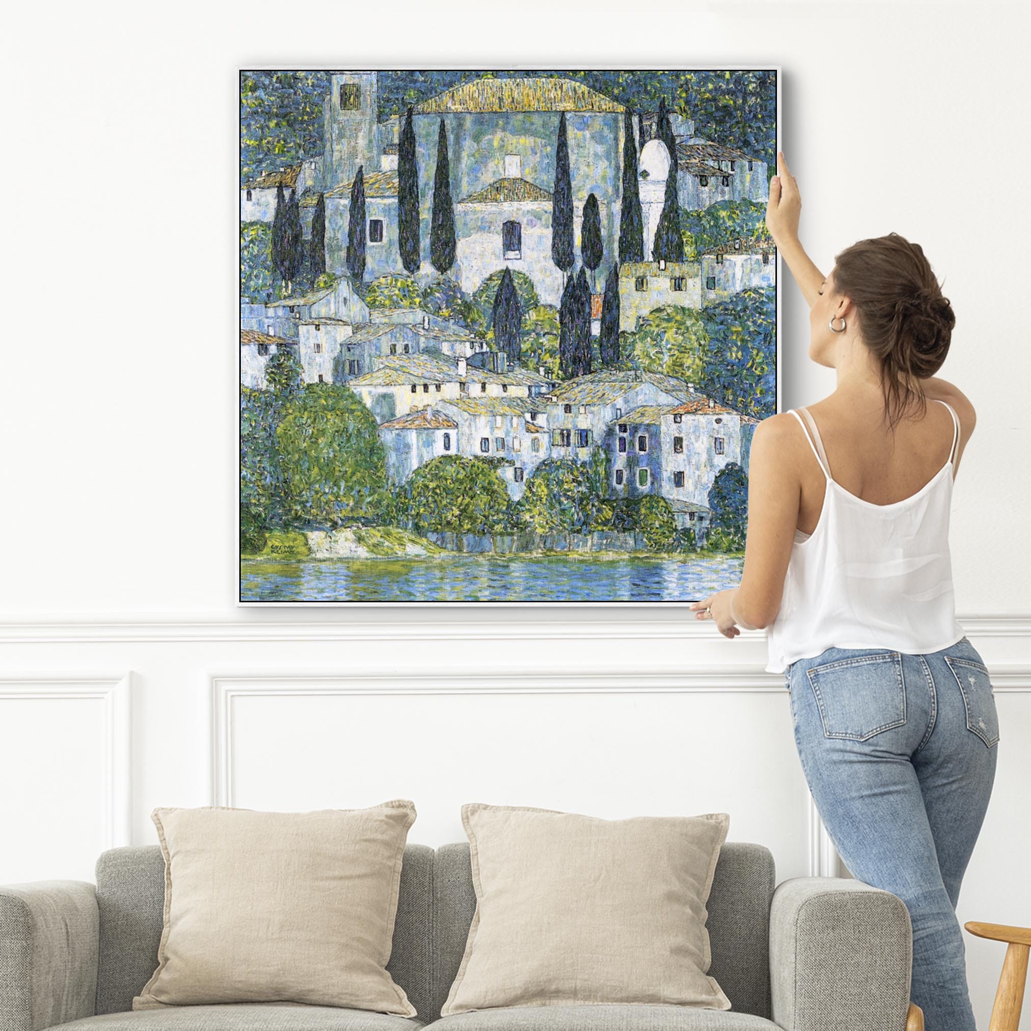 Large Blue Gustav Klimt Landscape Wall Art Framed Canvas Print of Kirche in Casseone Painting - 100cm x 100cm