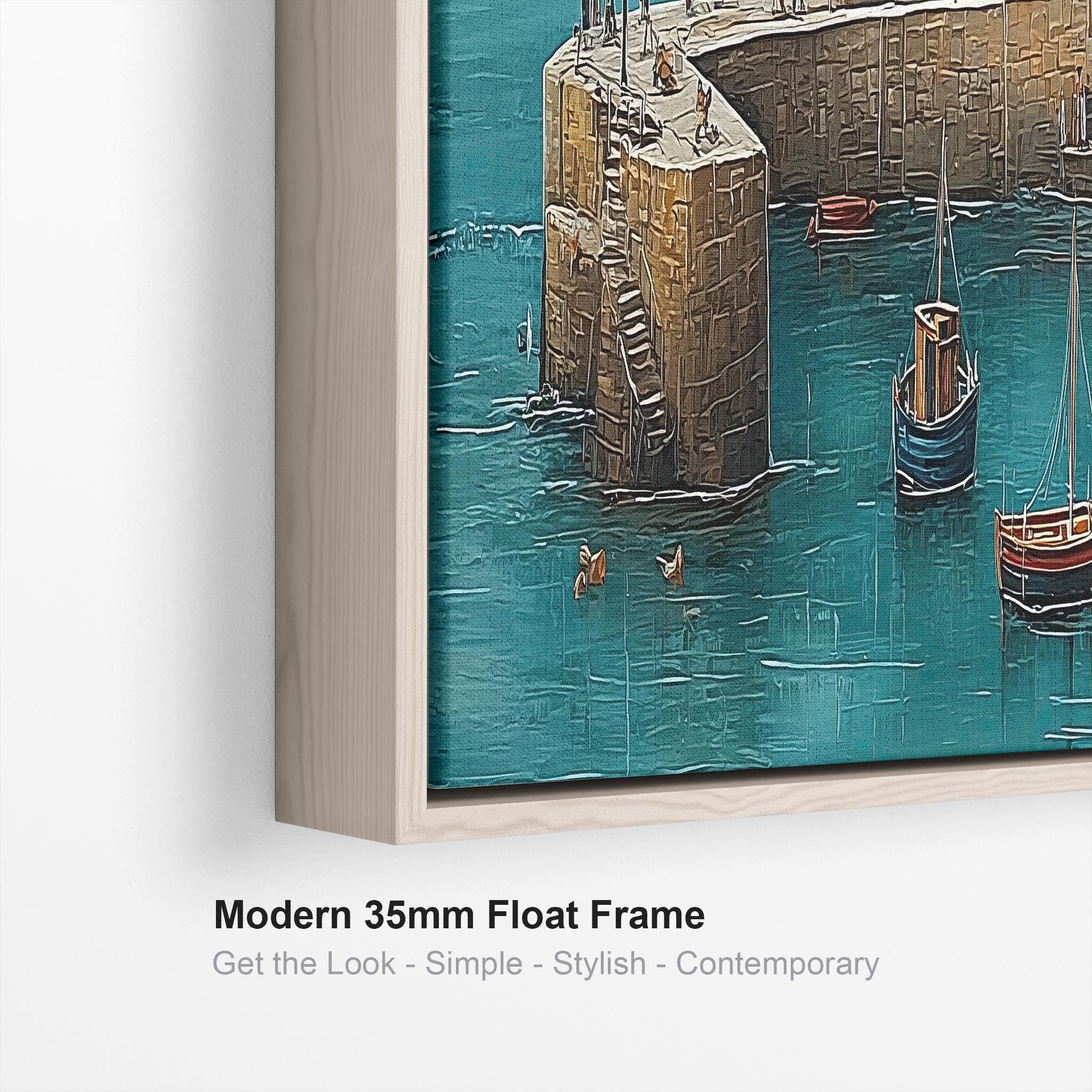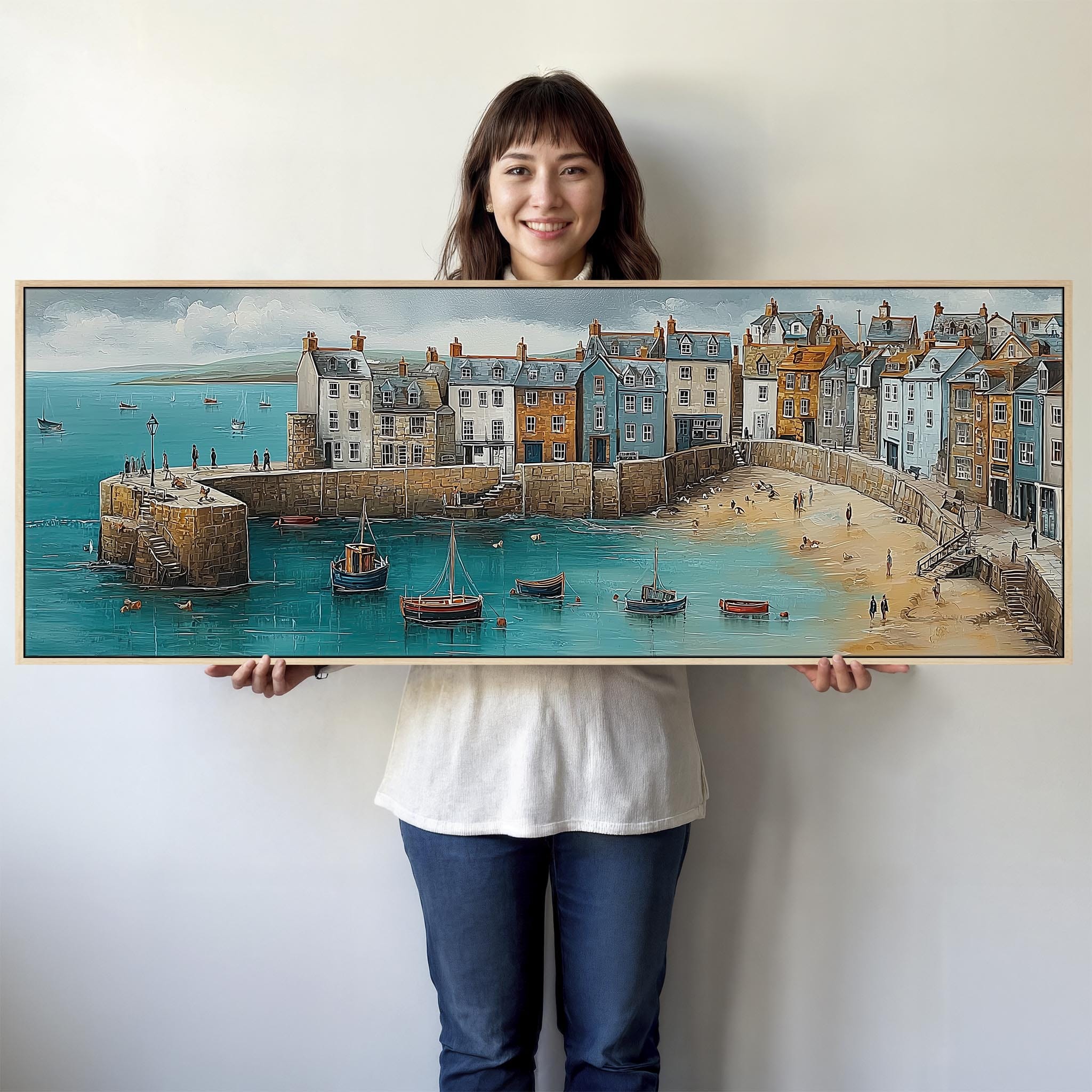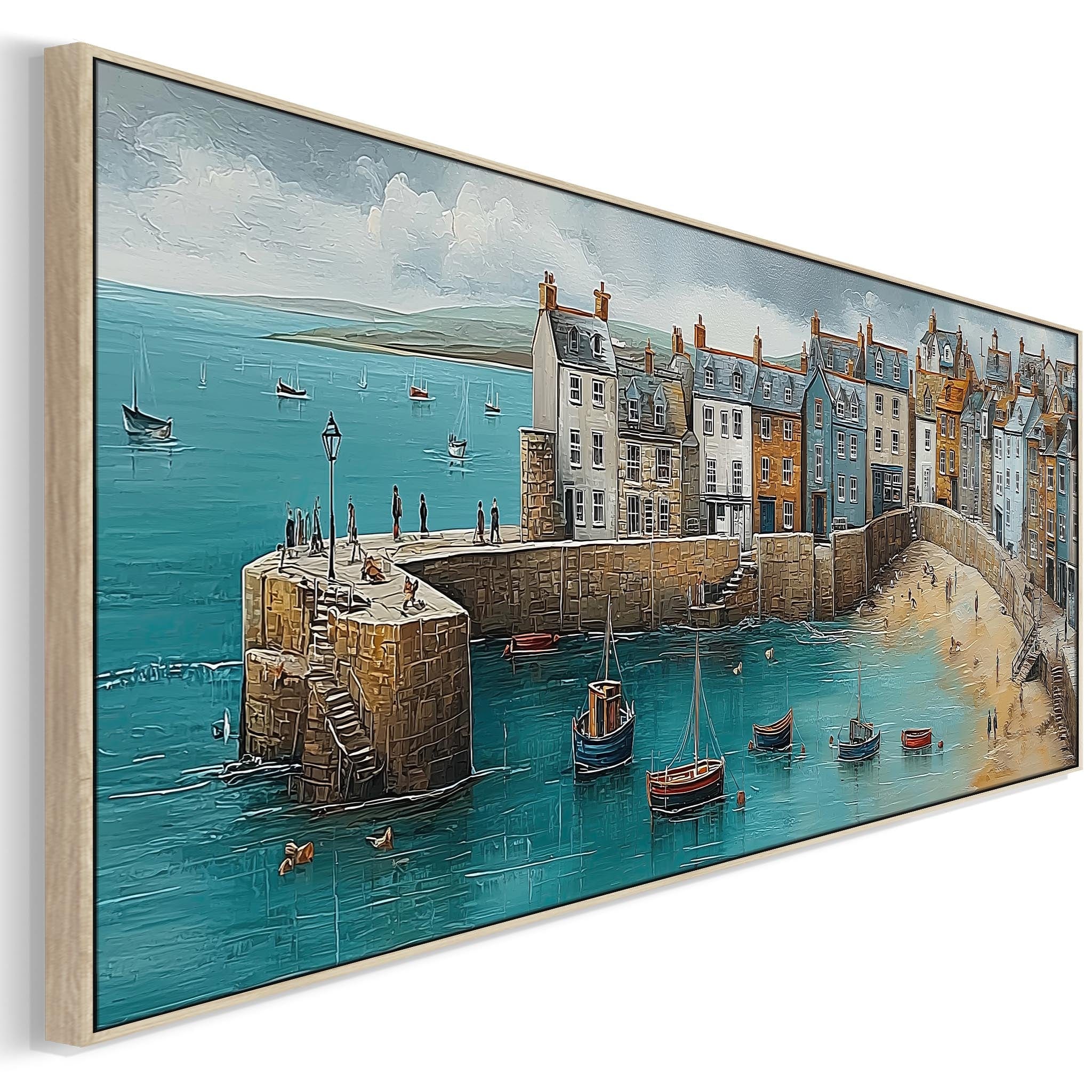 Coastal Cornwall Harbour Wide Framed Horizontal Wall Art in Blue