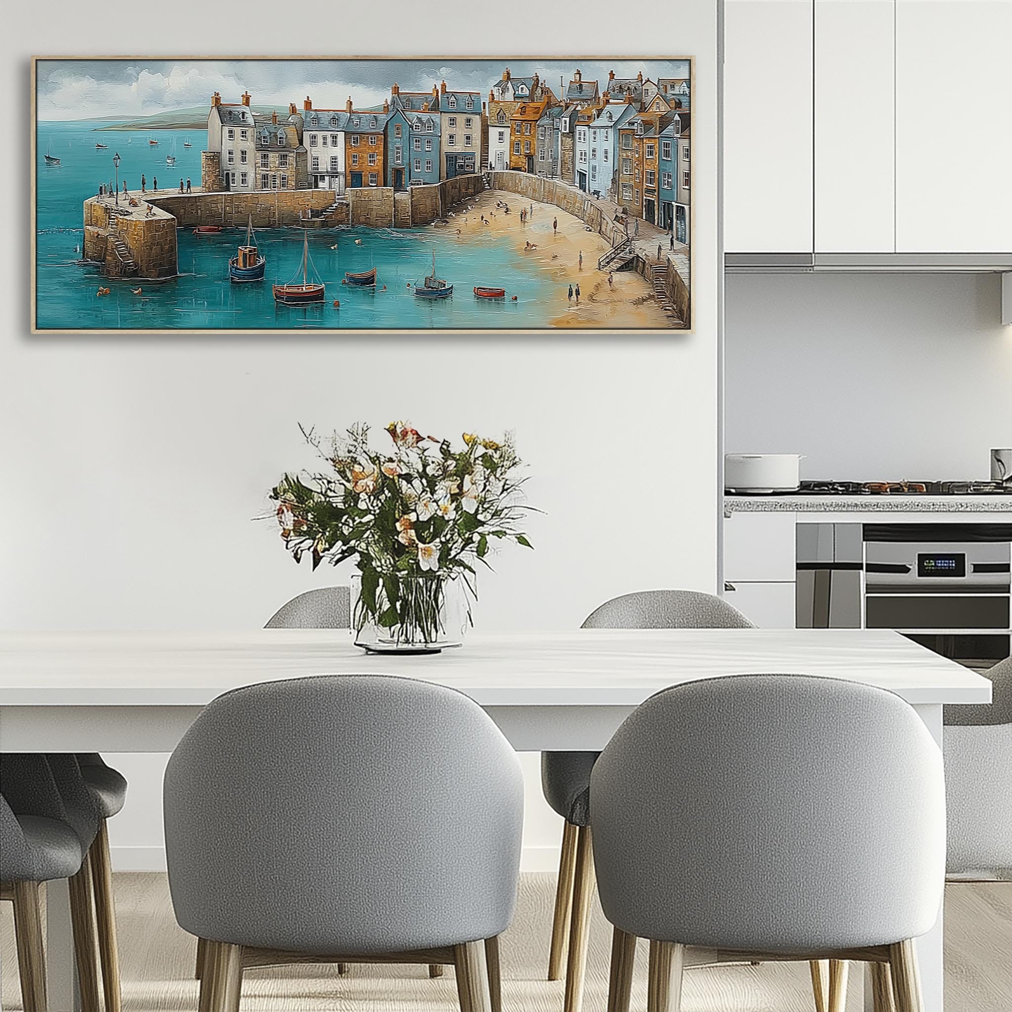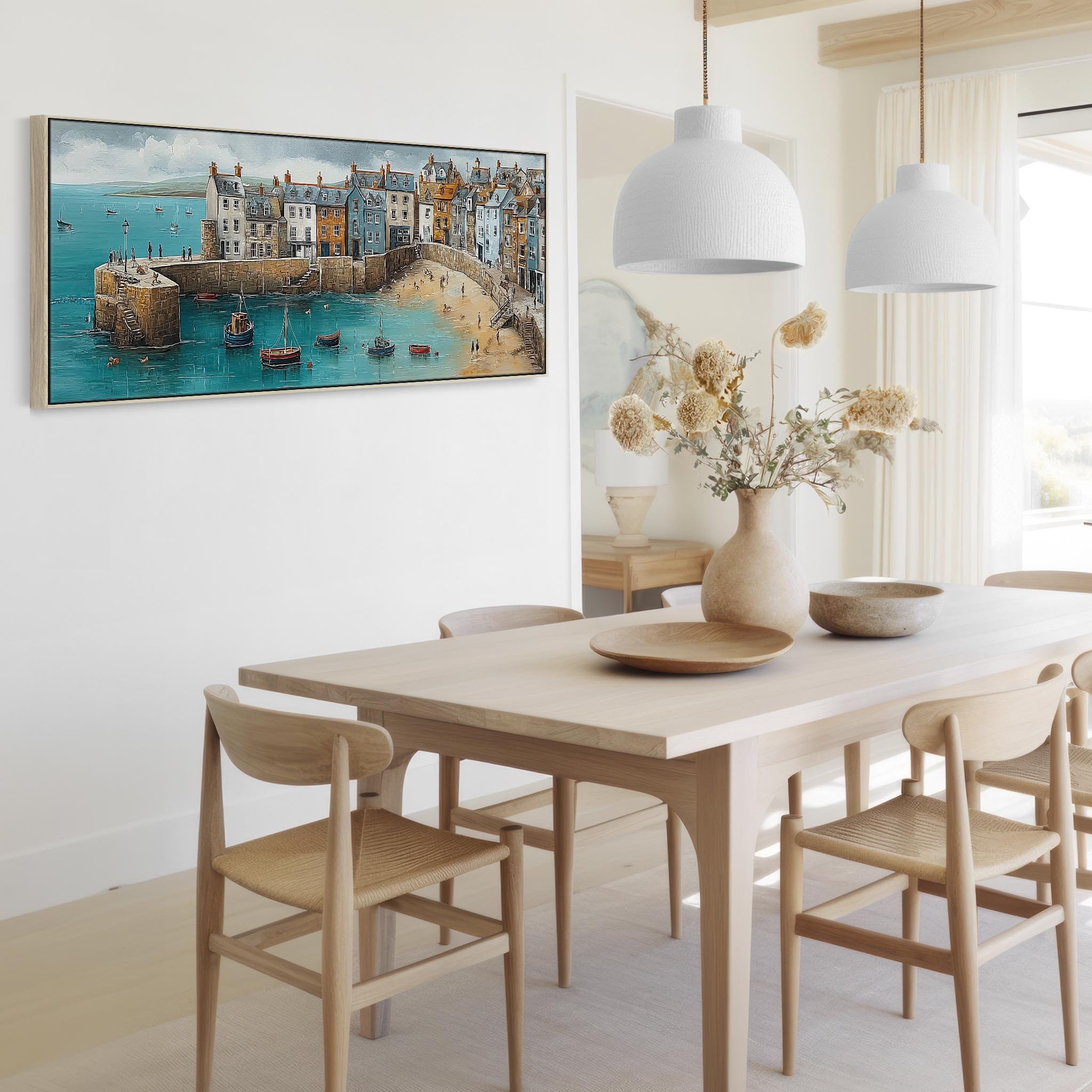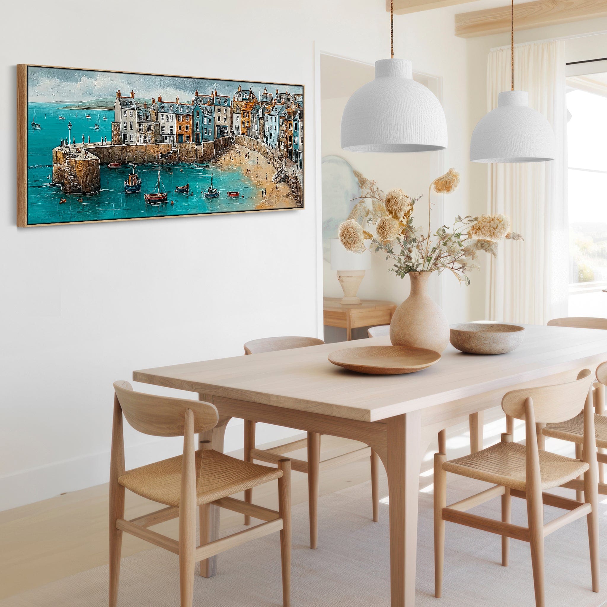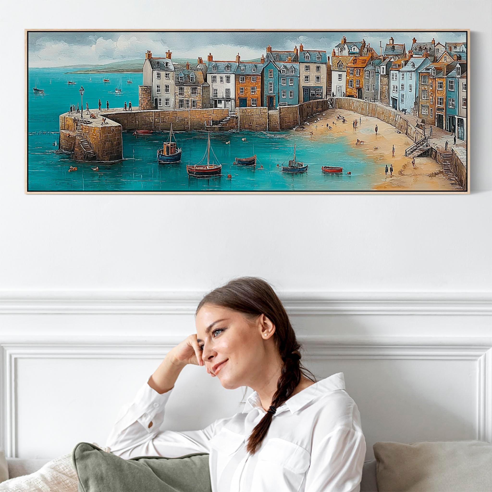 Coastal Cornwall Harbour Wide Framed Horizontal Wall Art in Blue