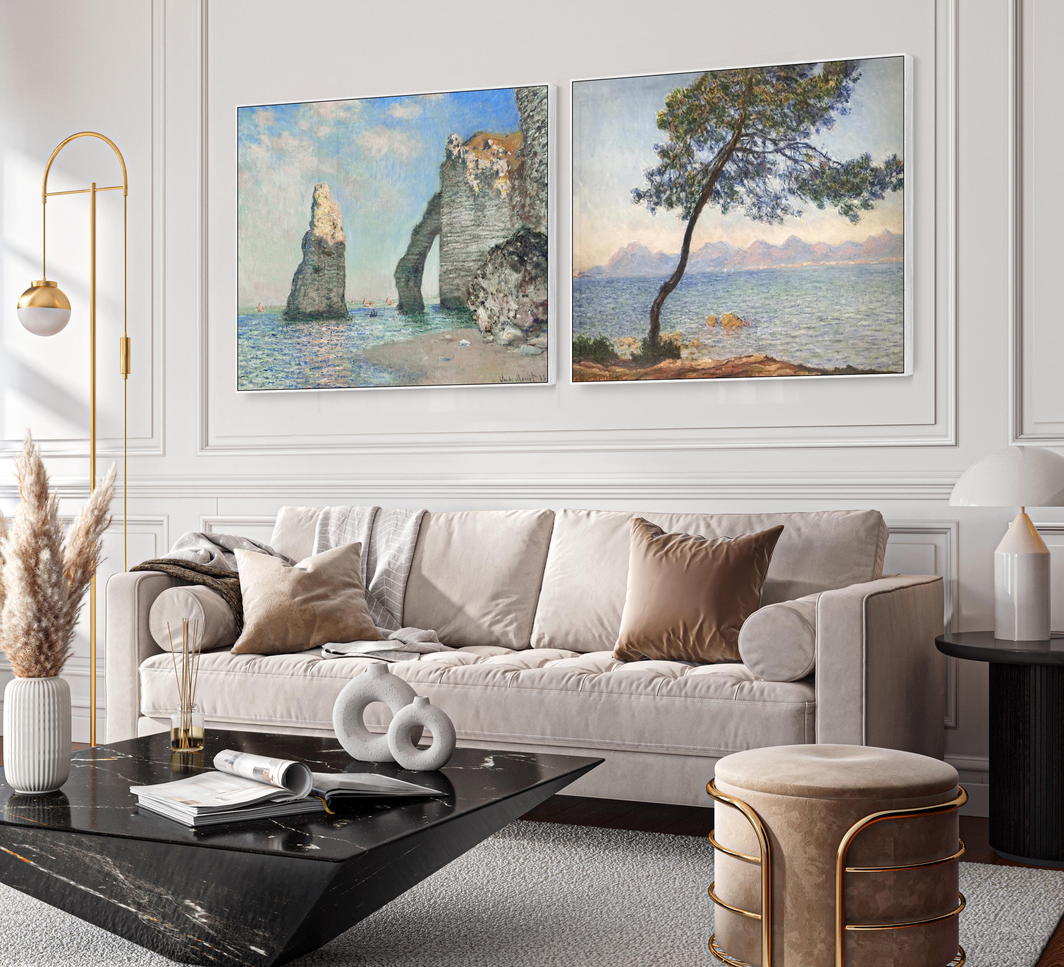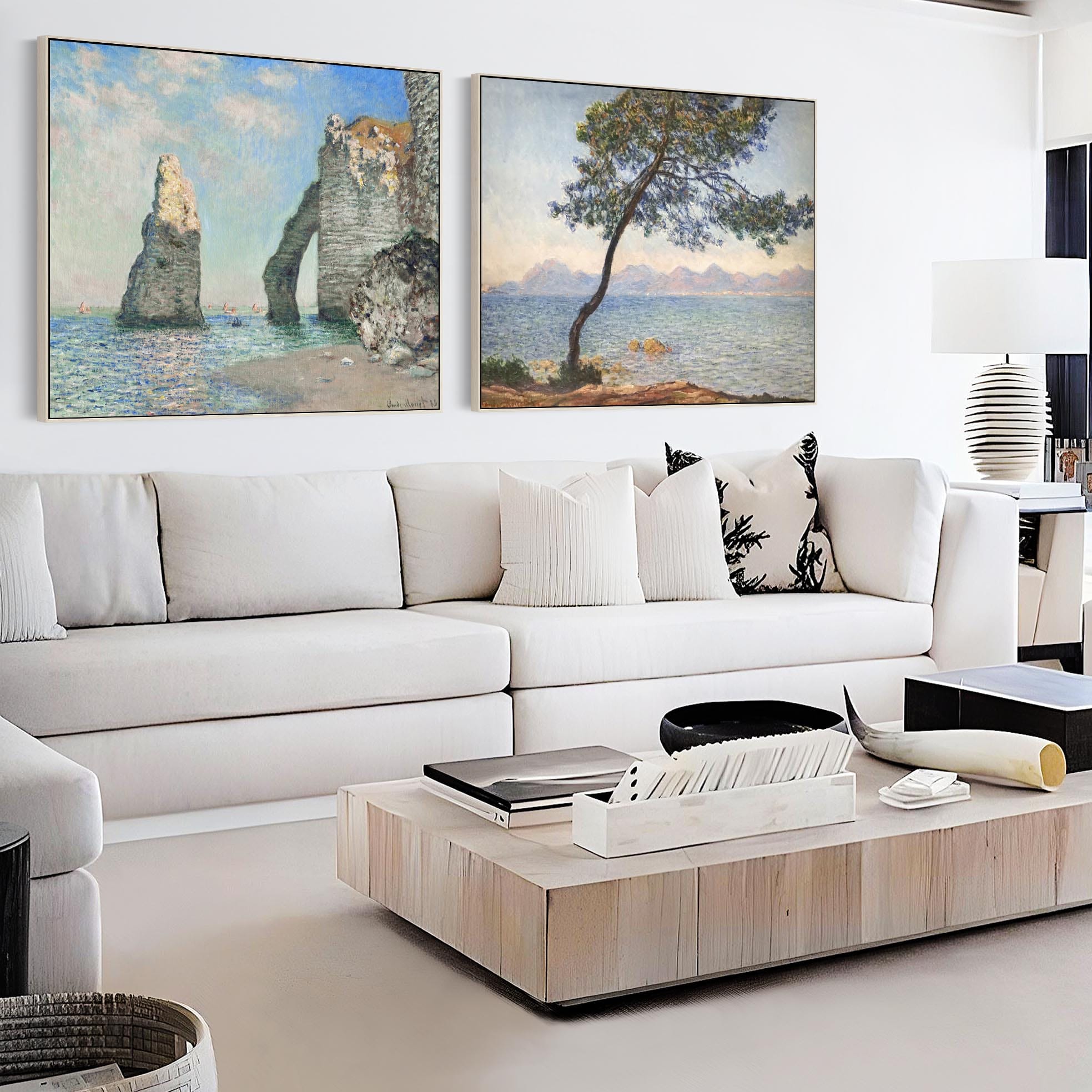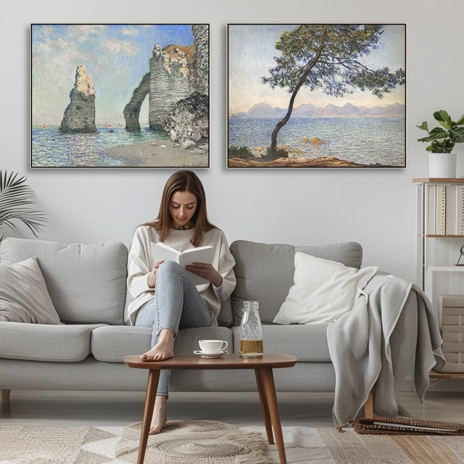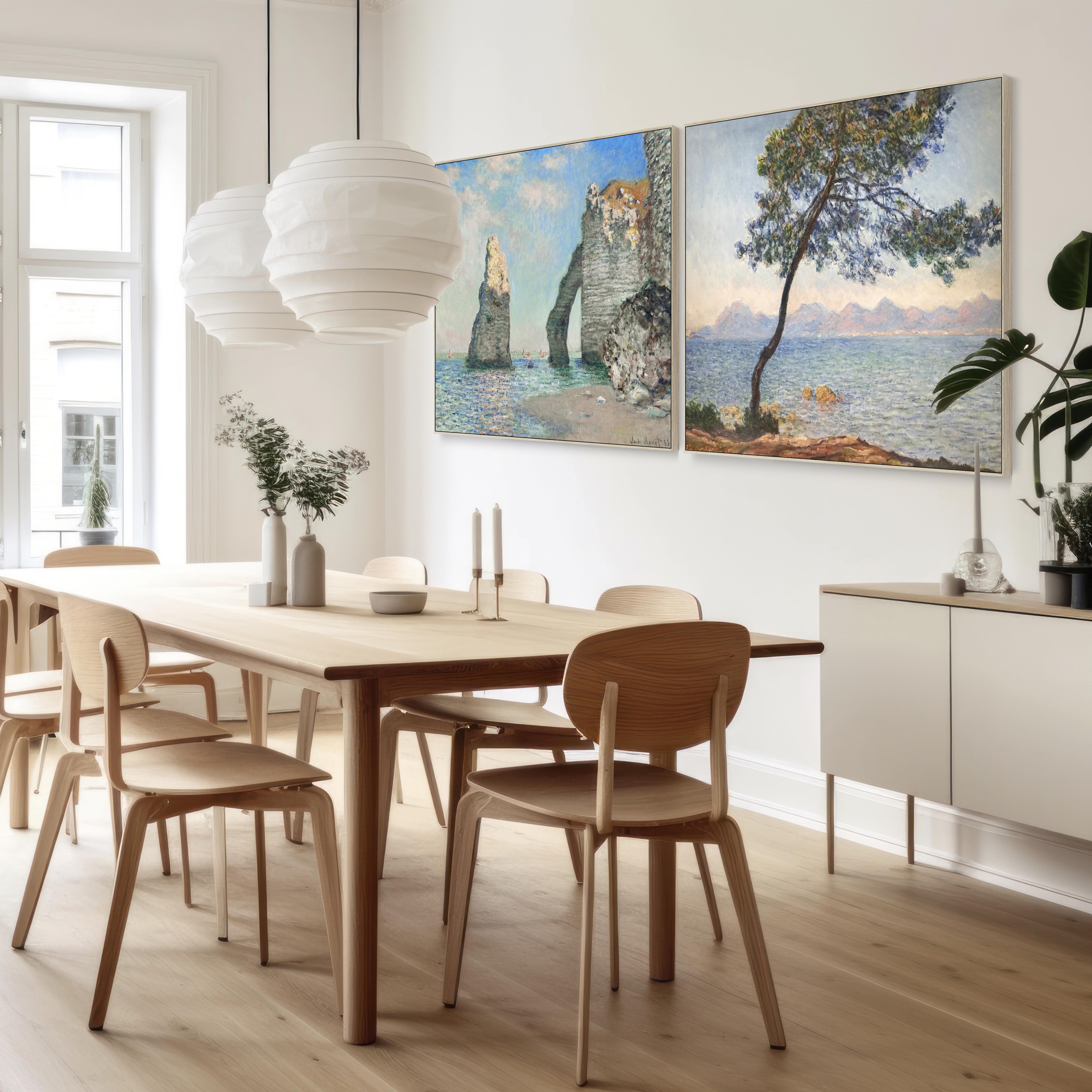 Extra Large Claude Monet Pair of Blue Beach Wall Art Framed Canvas Pictures - Set of 2