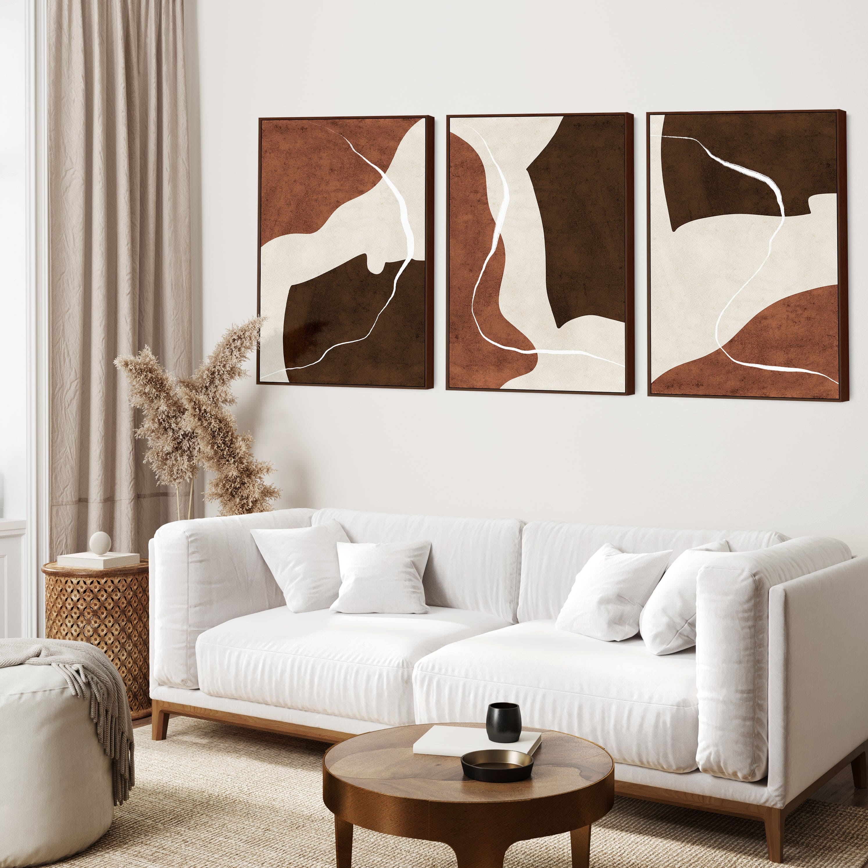 Extra Large Set of 3 Framed Wall Art for Living Room - Abstract Brown Canvas