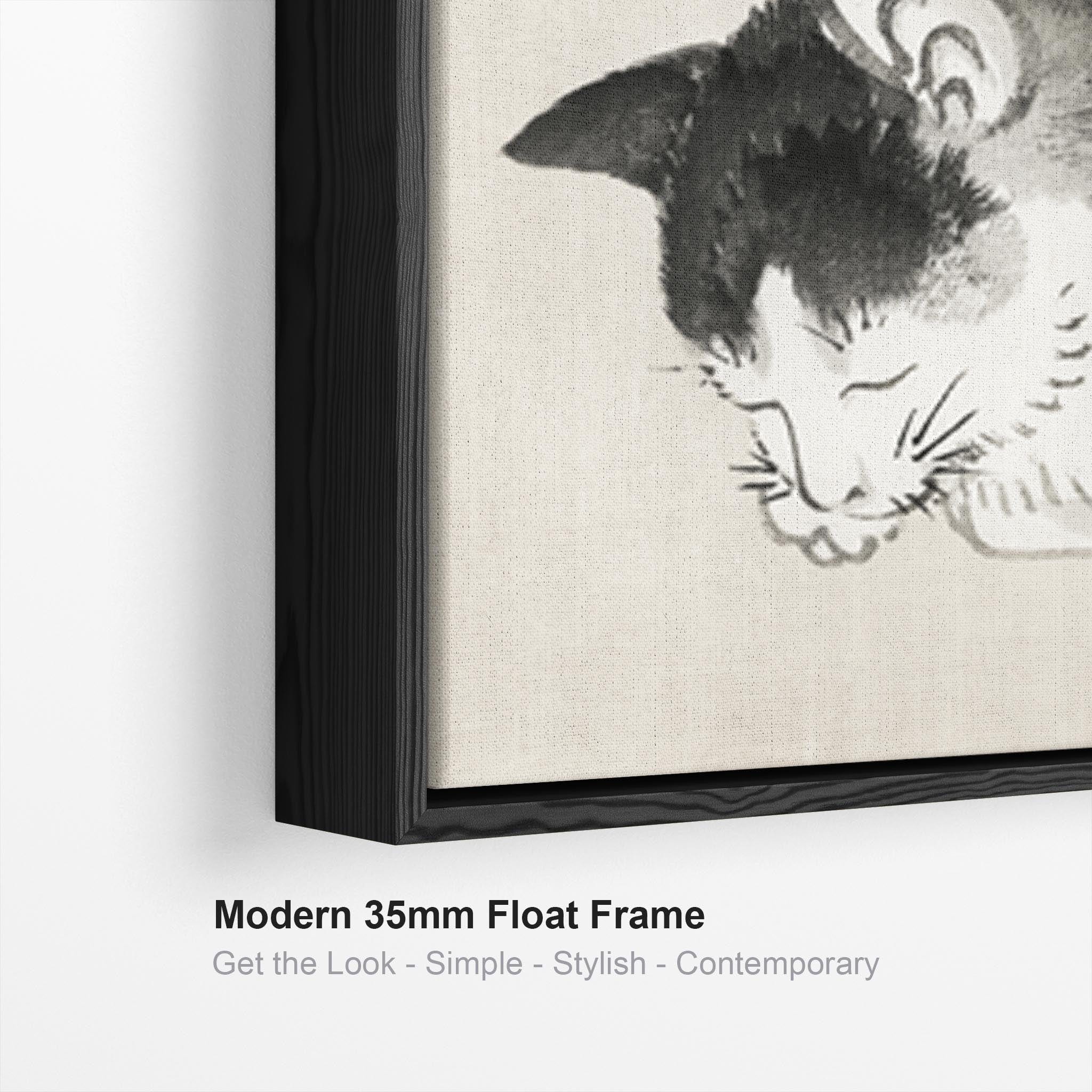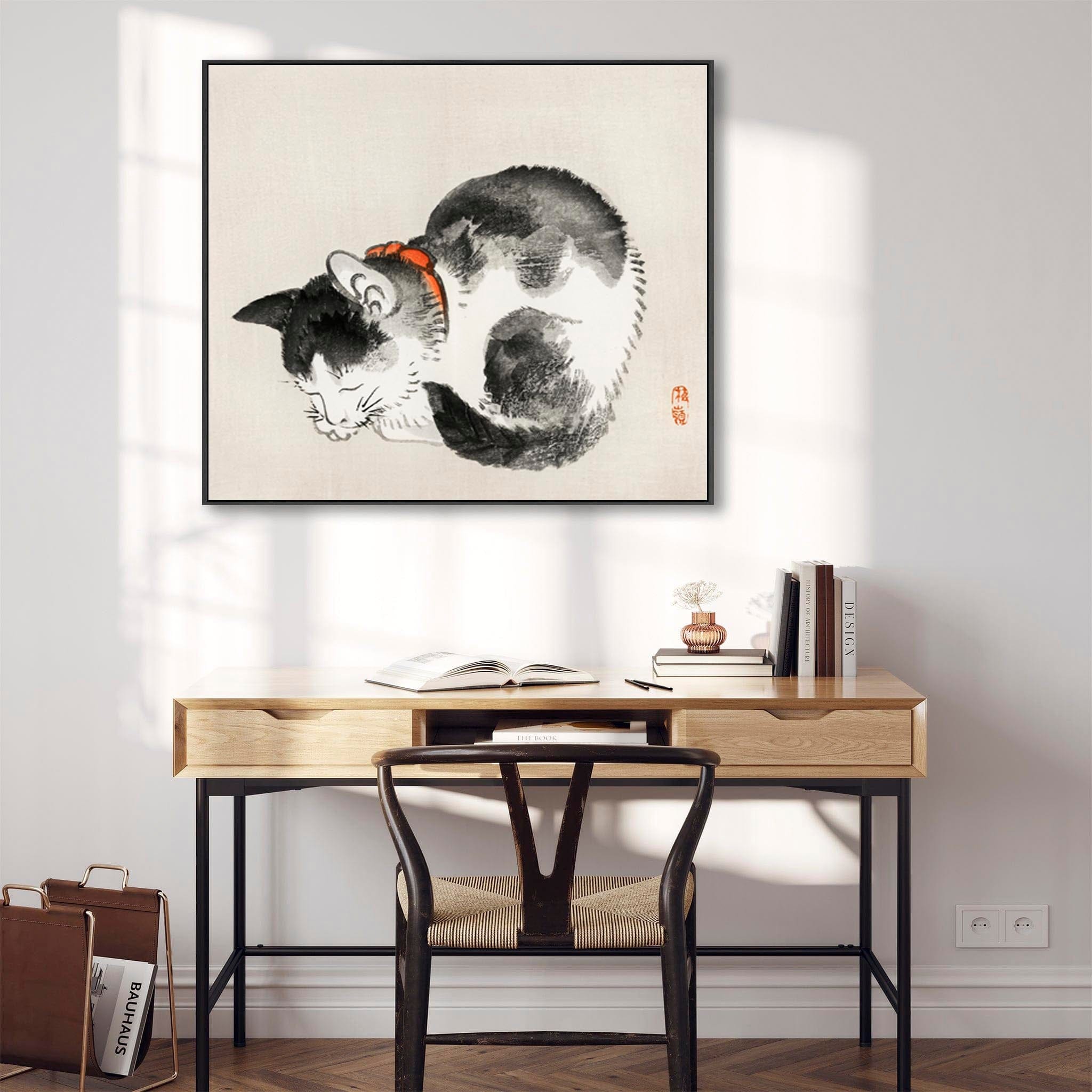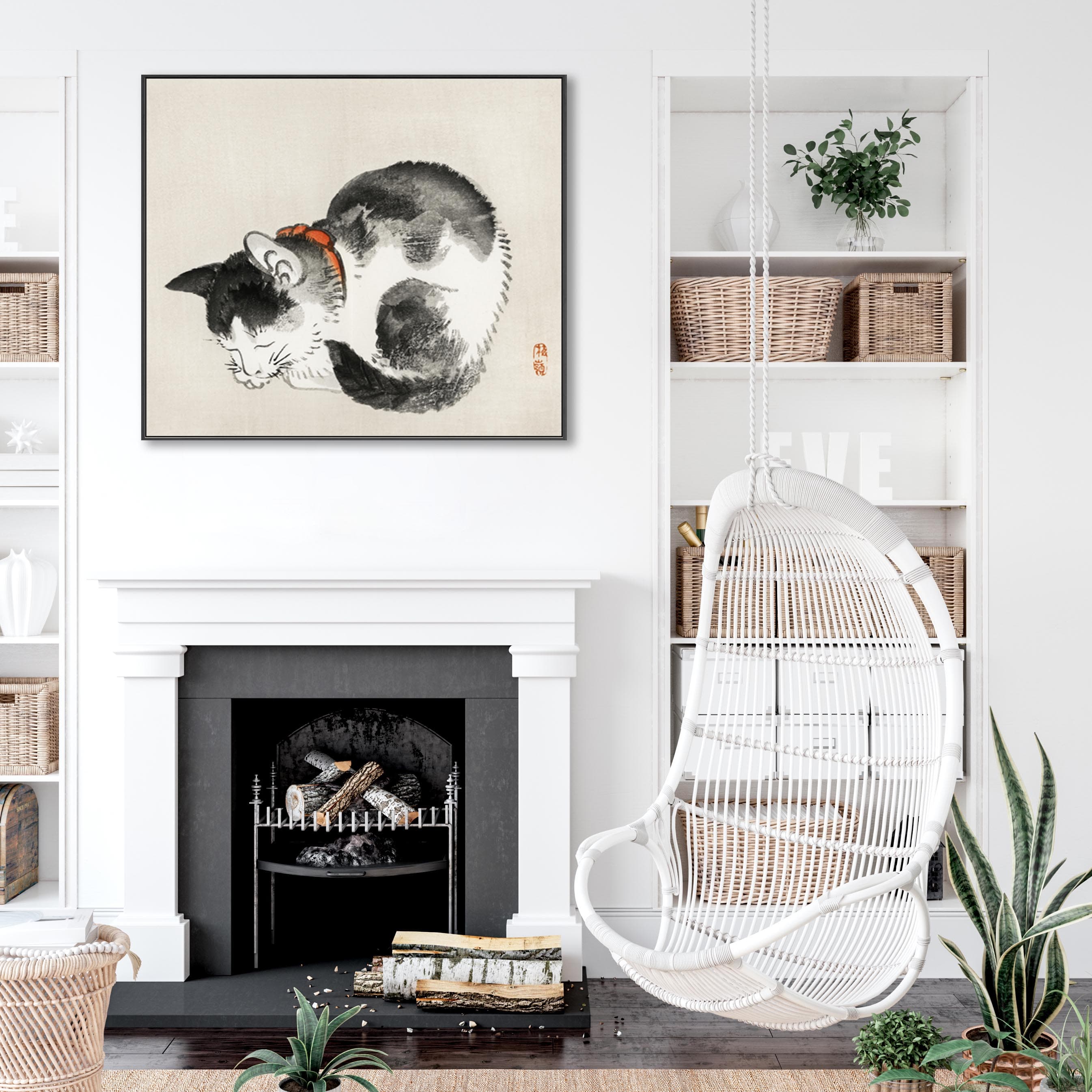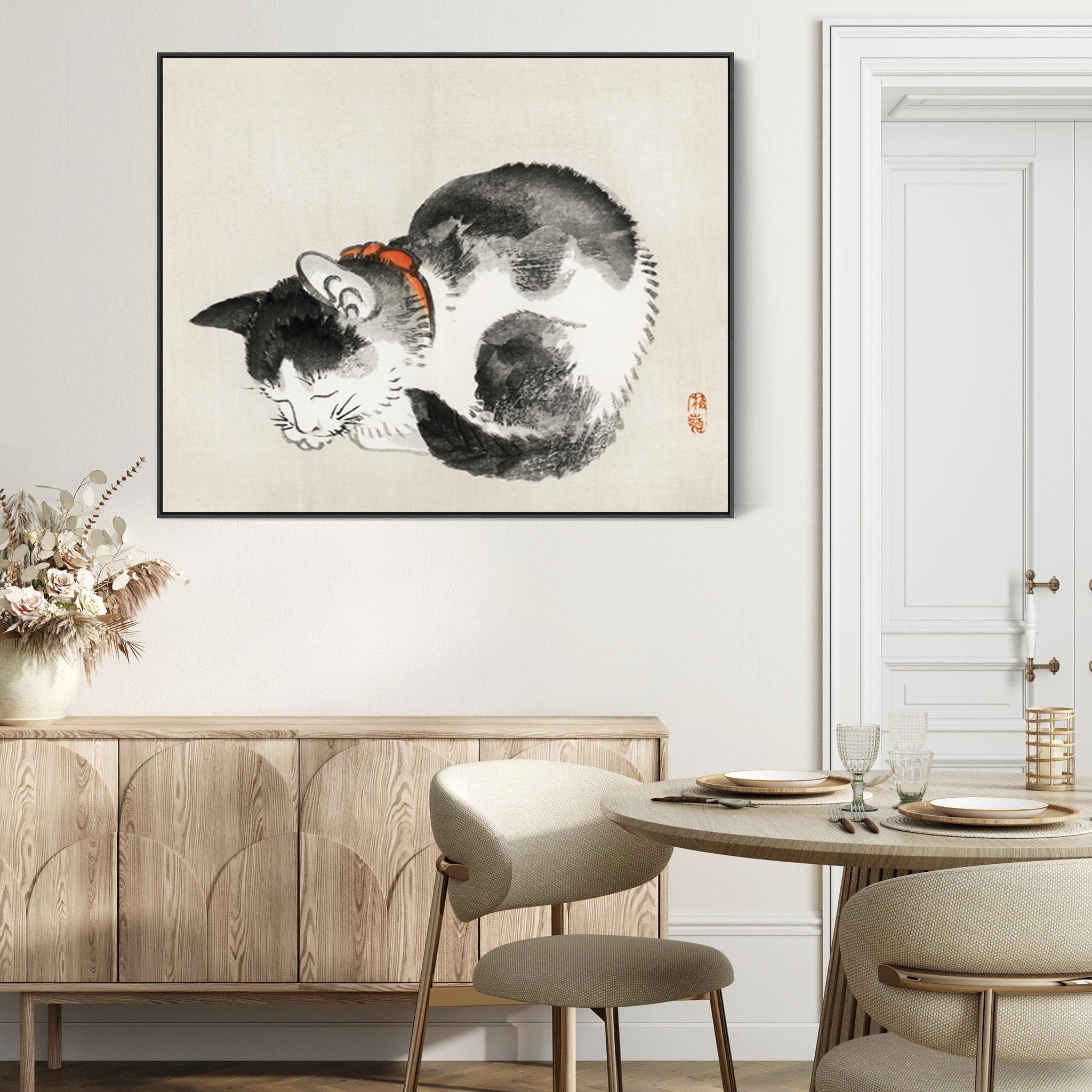 Japanese Sleeping Cat Black White Wall Art Framed Canvas Print by Kono Bairei