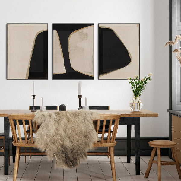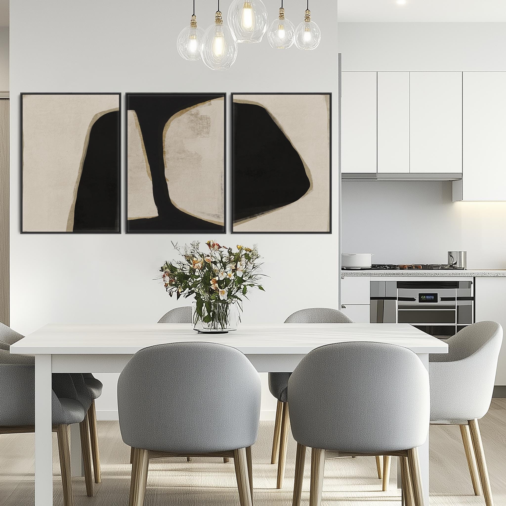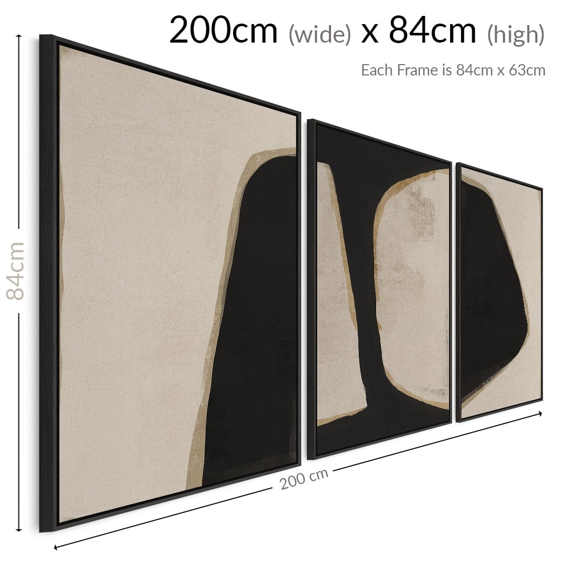 Large Beige Black Abstract Wall Art - Framed Canvas Set of 3