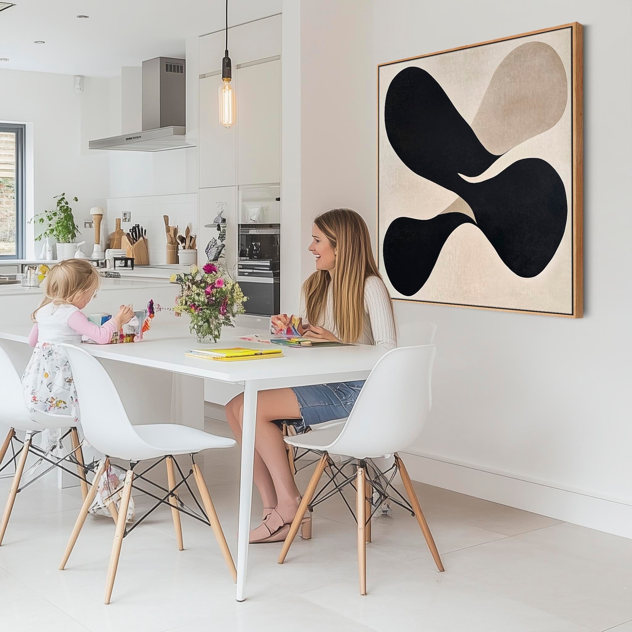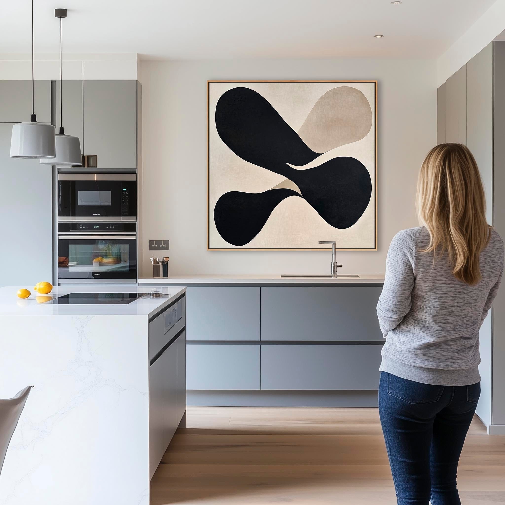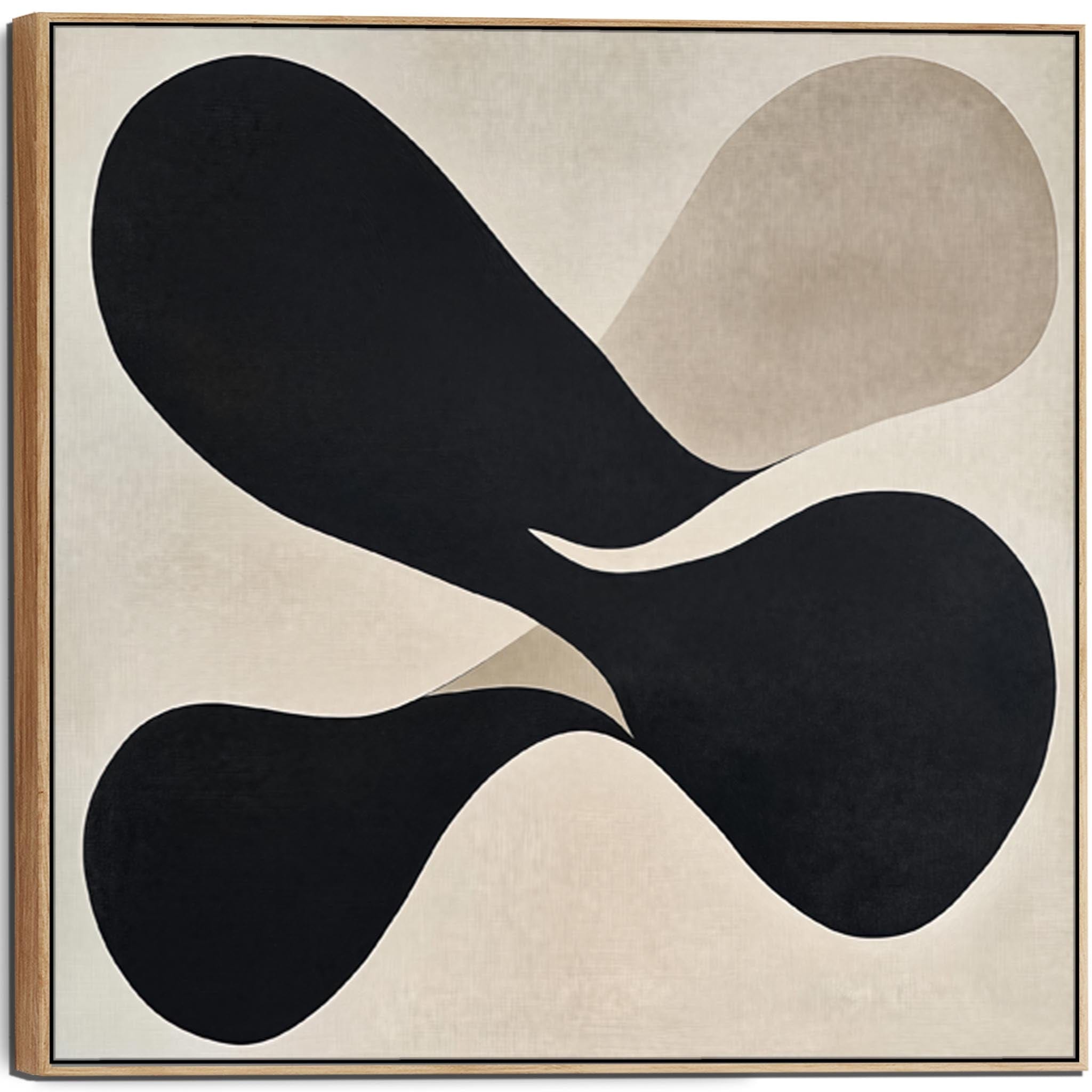 Elevate your space with abstract art in vivid beige and black hues, a captivating square layout, and a light oak frame. Every detail draws the eye in your hallway and adds a unique personality.