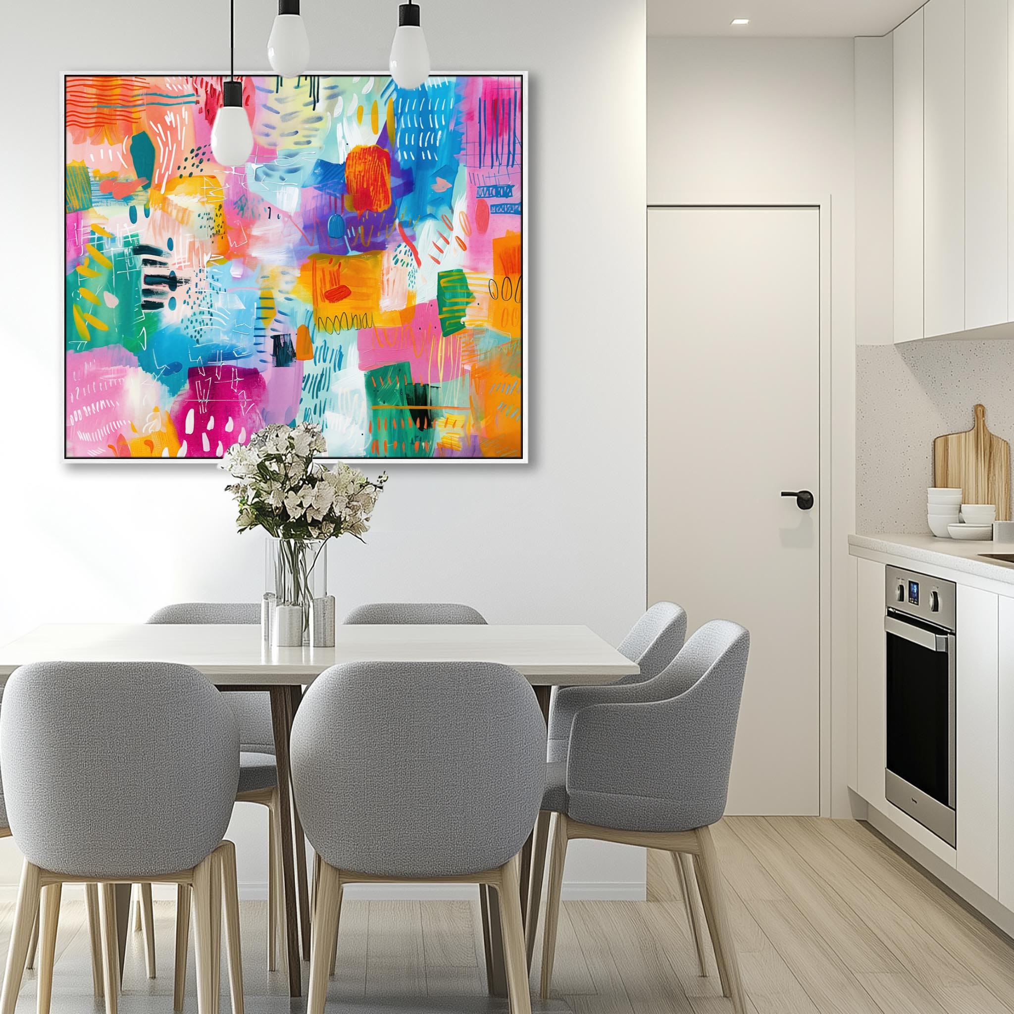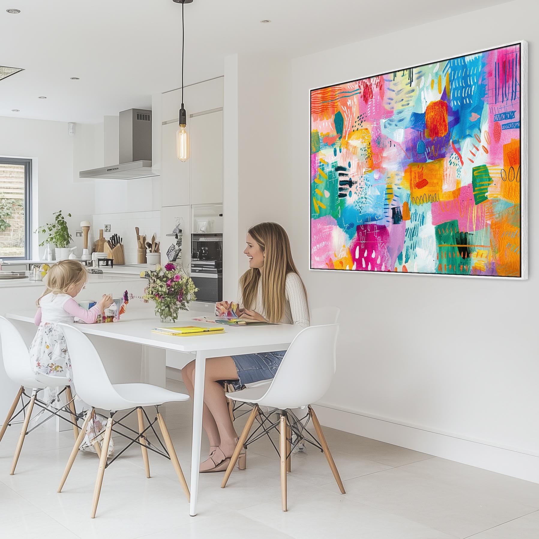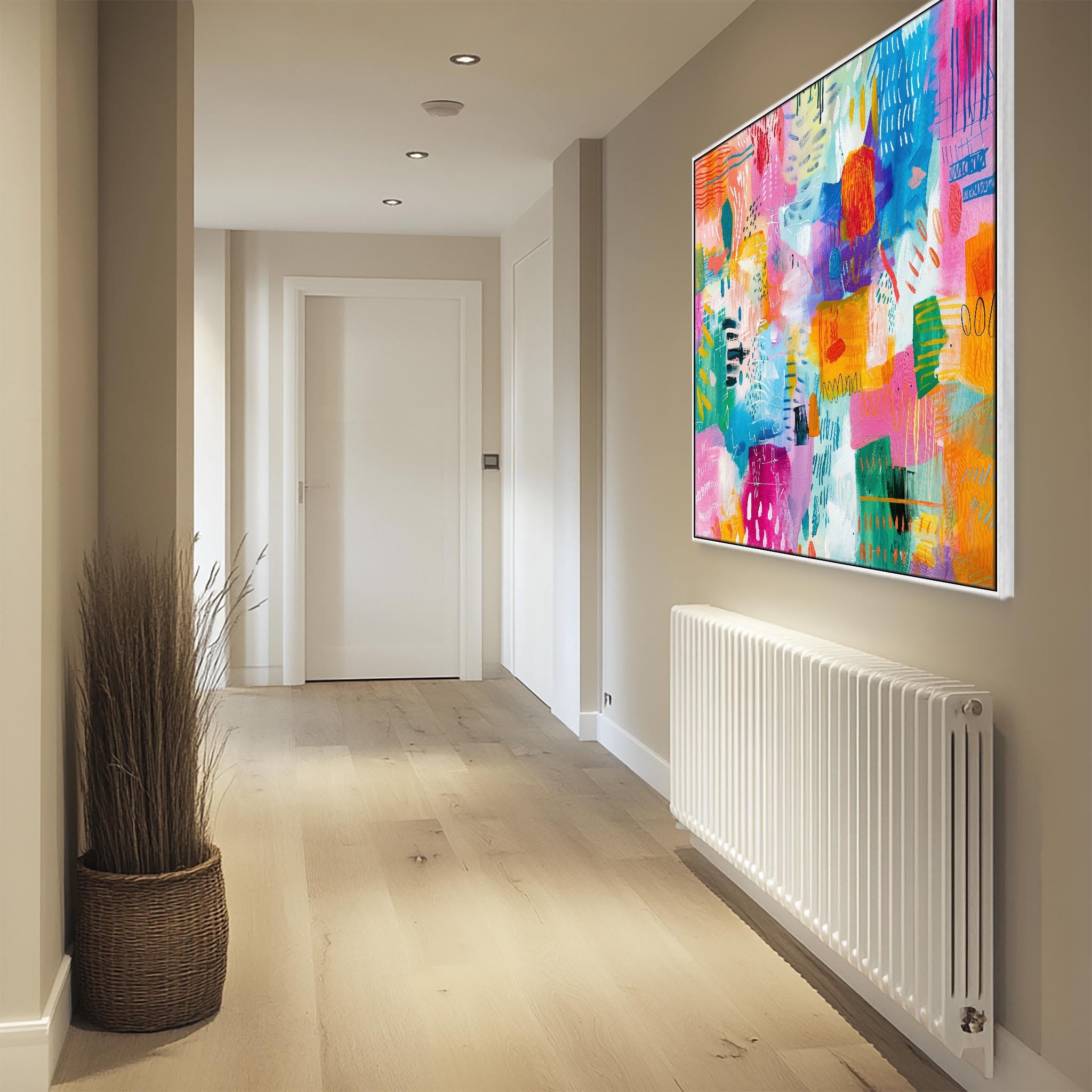 Enhance your decor with abstract art, painted in vivid multi-coloured hues and a bold landscape design, paired with a White. It adds a layer of character and draws the eye.