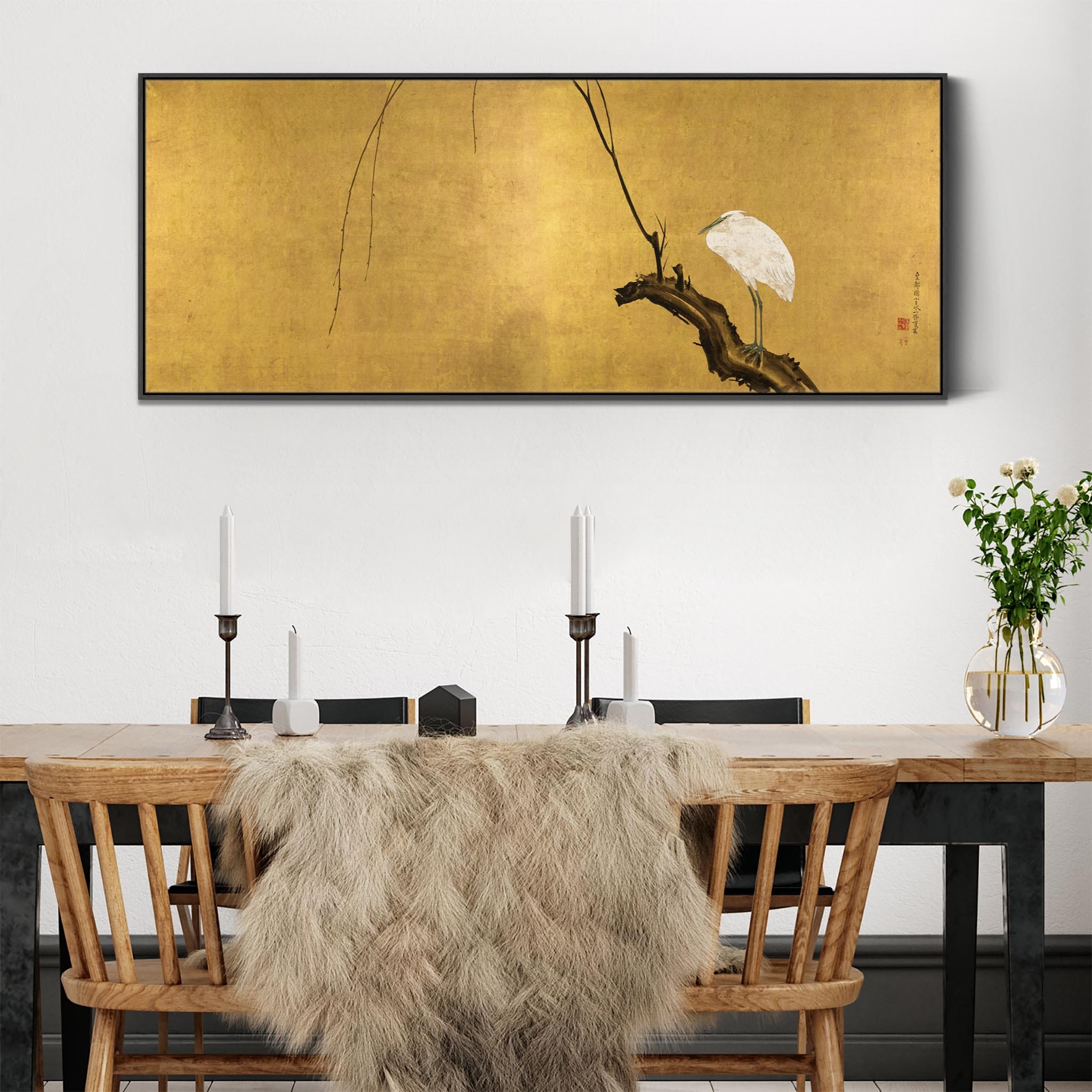 Mustard Yellow Japanese Framed Art Print Canvas Maruyama Okyo - Heron Willow Branch