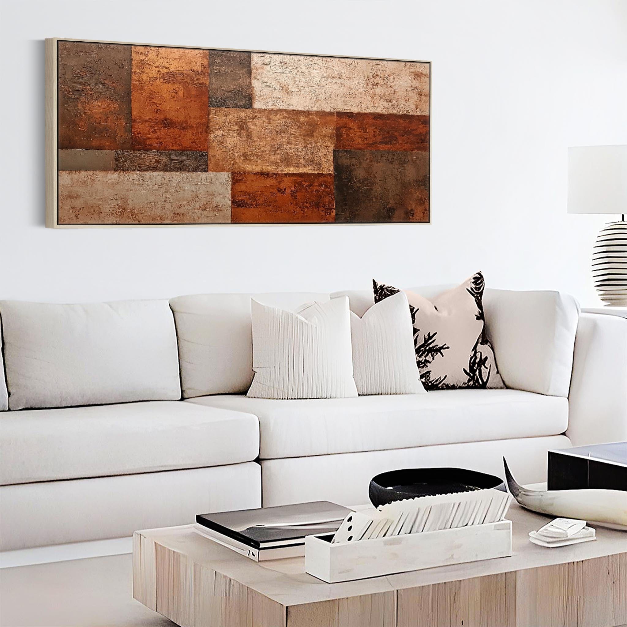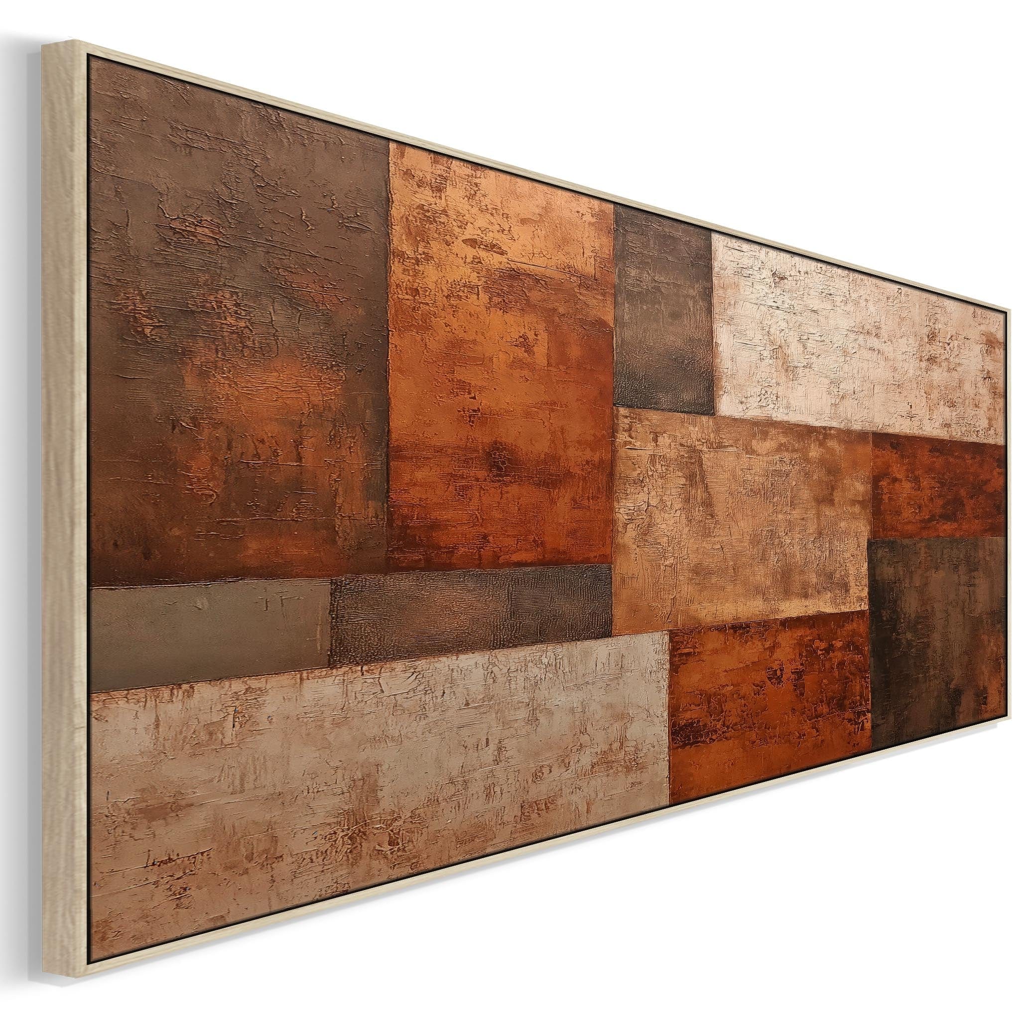 Let abstract art in orange and brown tones and a dynamic panoramic style, framed in a neutral frame, breathe life into your room. A perfect mix of colour, light, and texture.