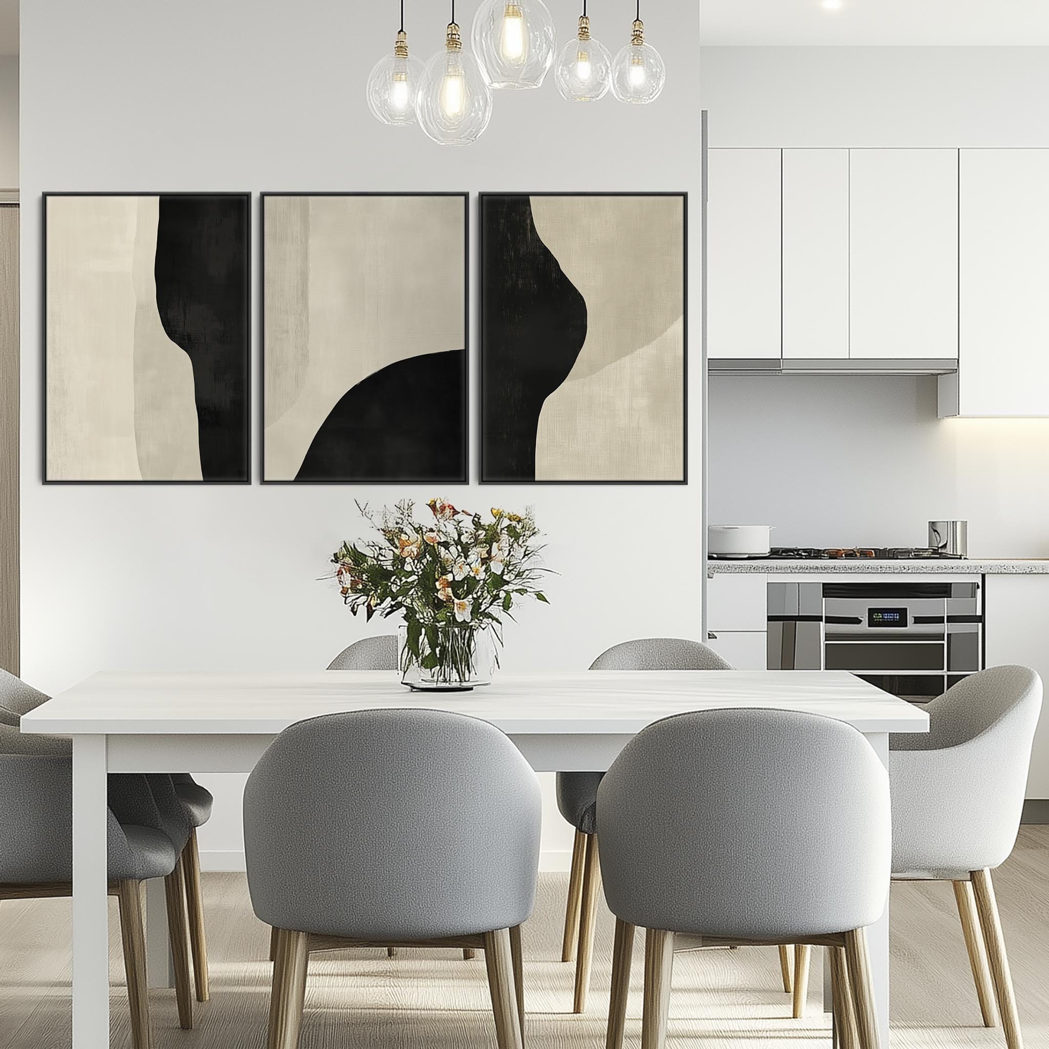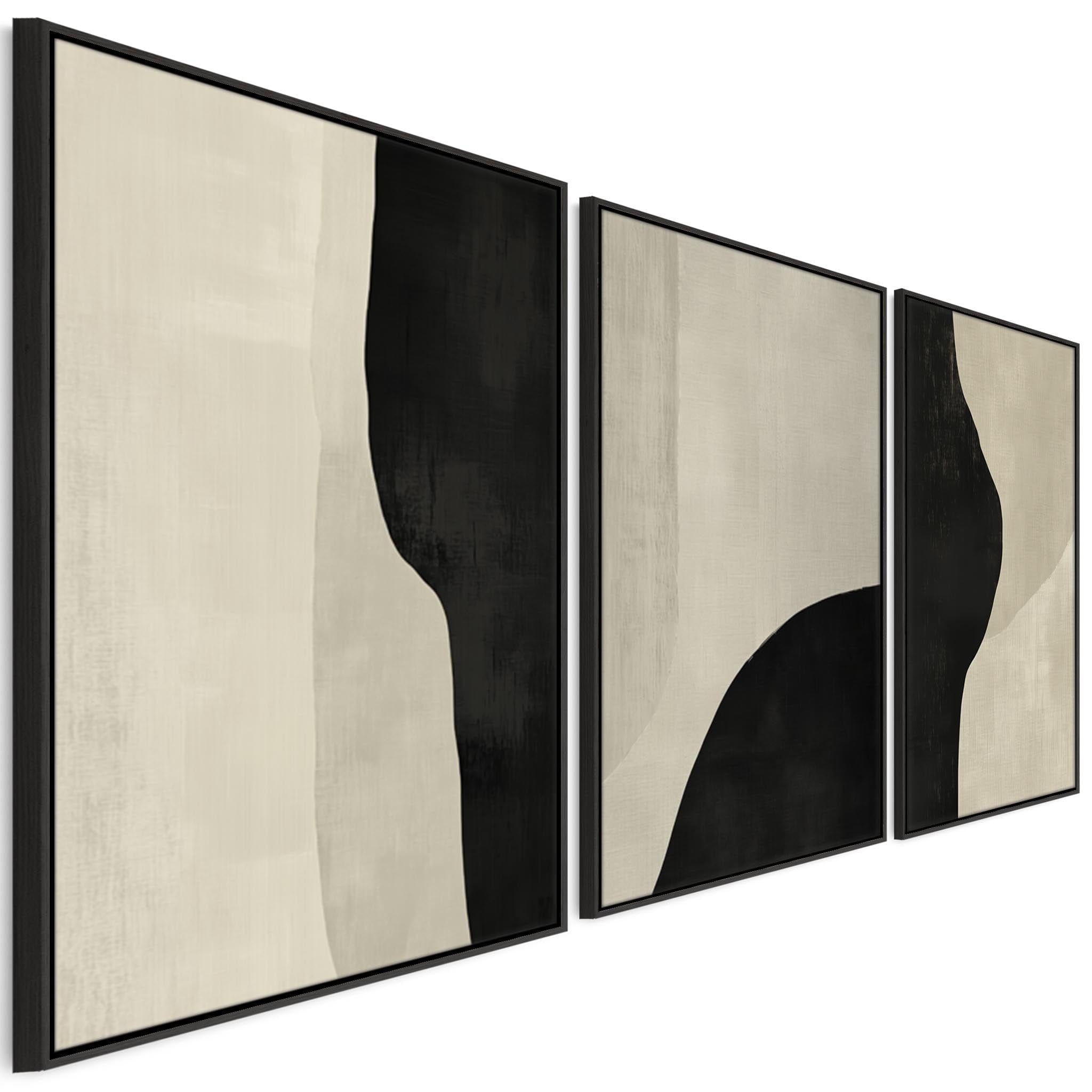 Enhance your decor with abstract art, painted in vivid cream and black hues and a bold triptych design, paired with a black frame. It adds a layer of character and draws the eye.