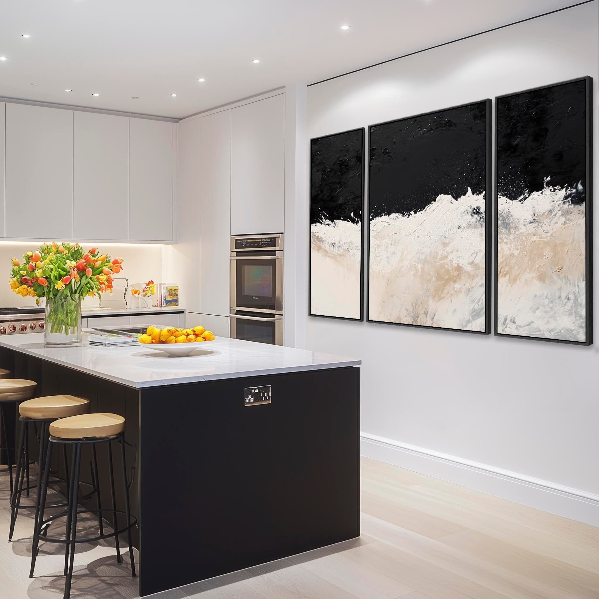 Capture attention with abstract art in rich beige and black shades, a striking set of 3 design, and a black frame. Adds depth and transforms your space into a visual story.
