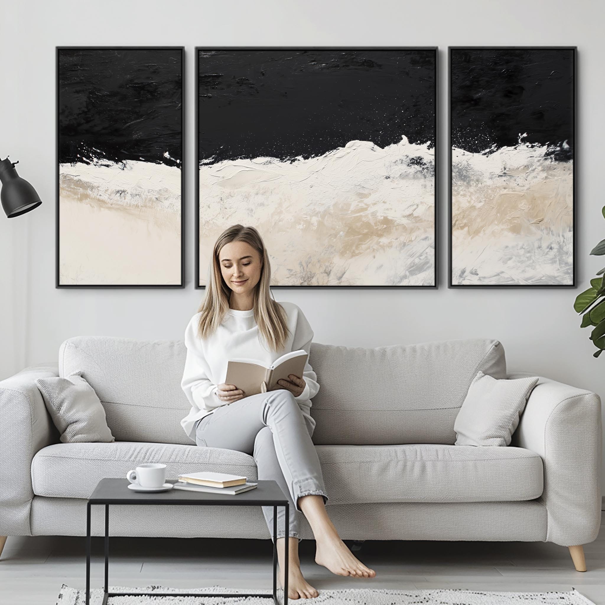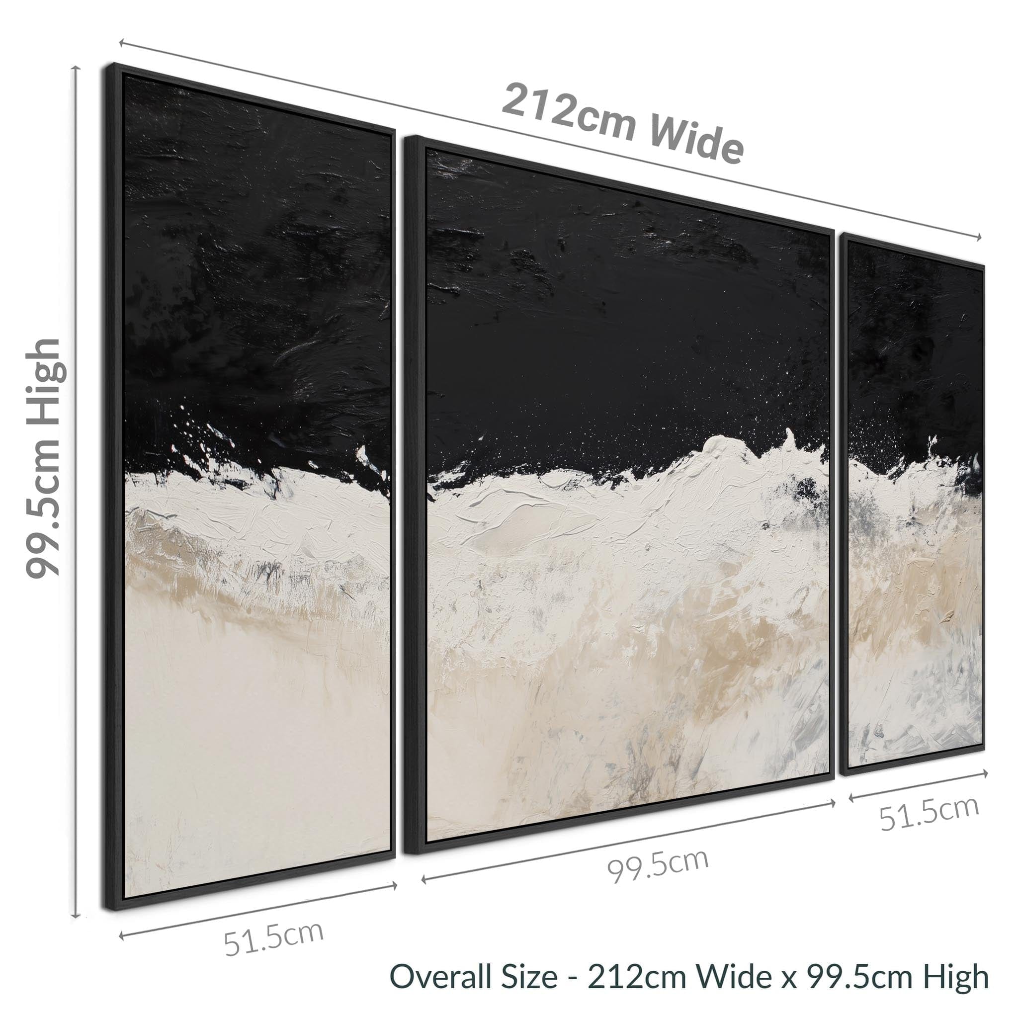 Set of 3 Neutral Beige Black Framed Canvas Wall Art Abstract Wave