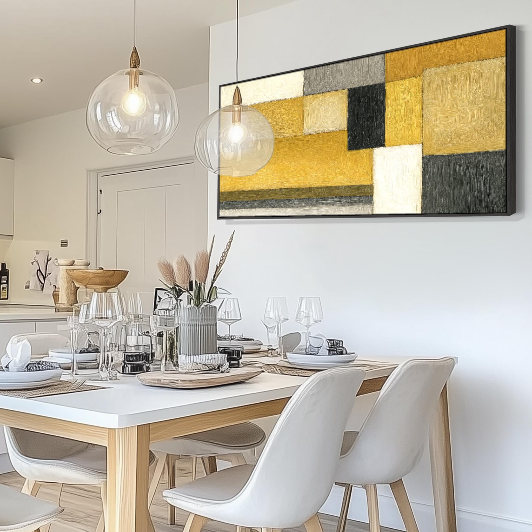 Wide Mustard Yellow Grey Framed Horizontal Canvas Wall Art - Abstract Steps