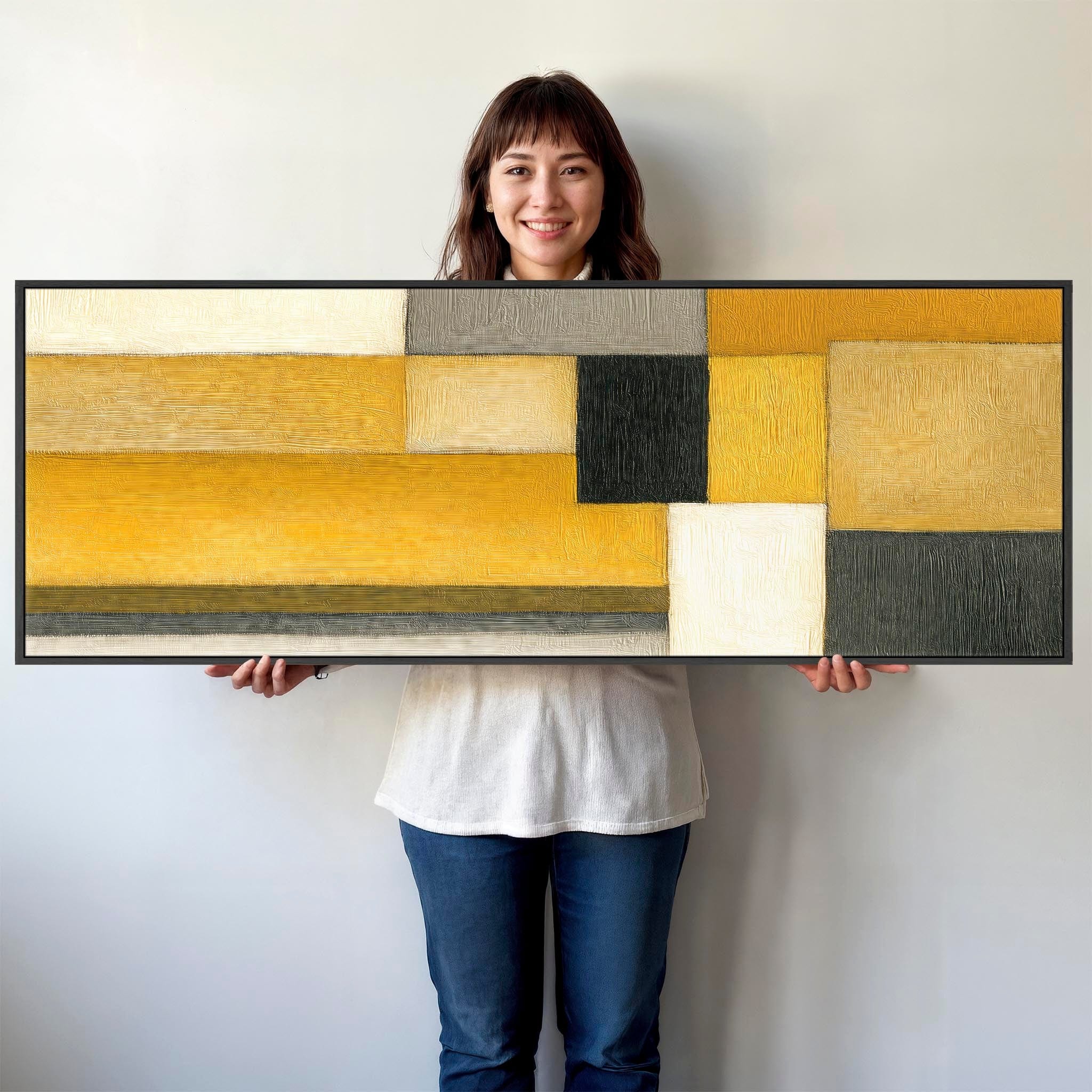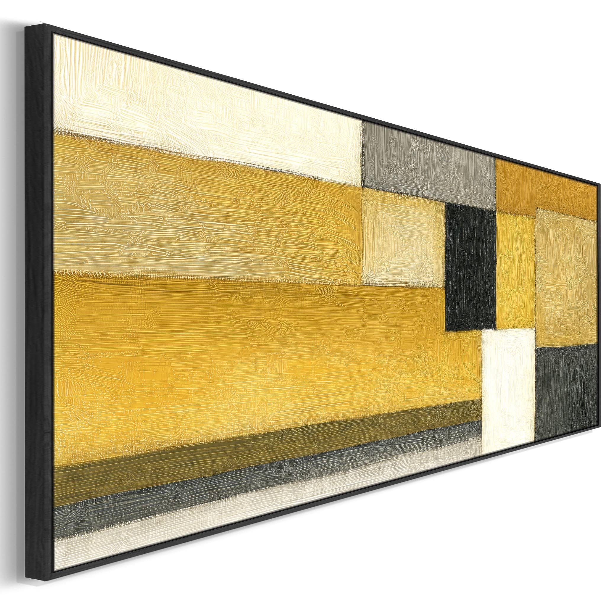 Capture attention with abstract art in rich mustard and yellow shades, a striking panoramic design, and a black frame. Adds depth and transforms your space into a visual story.