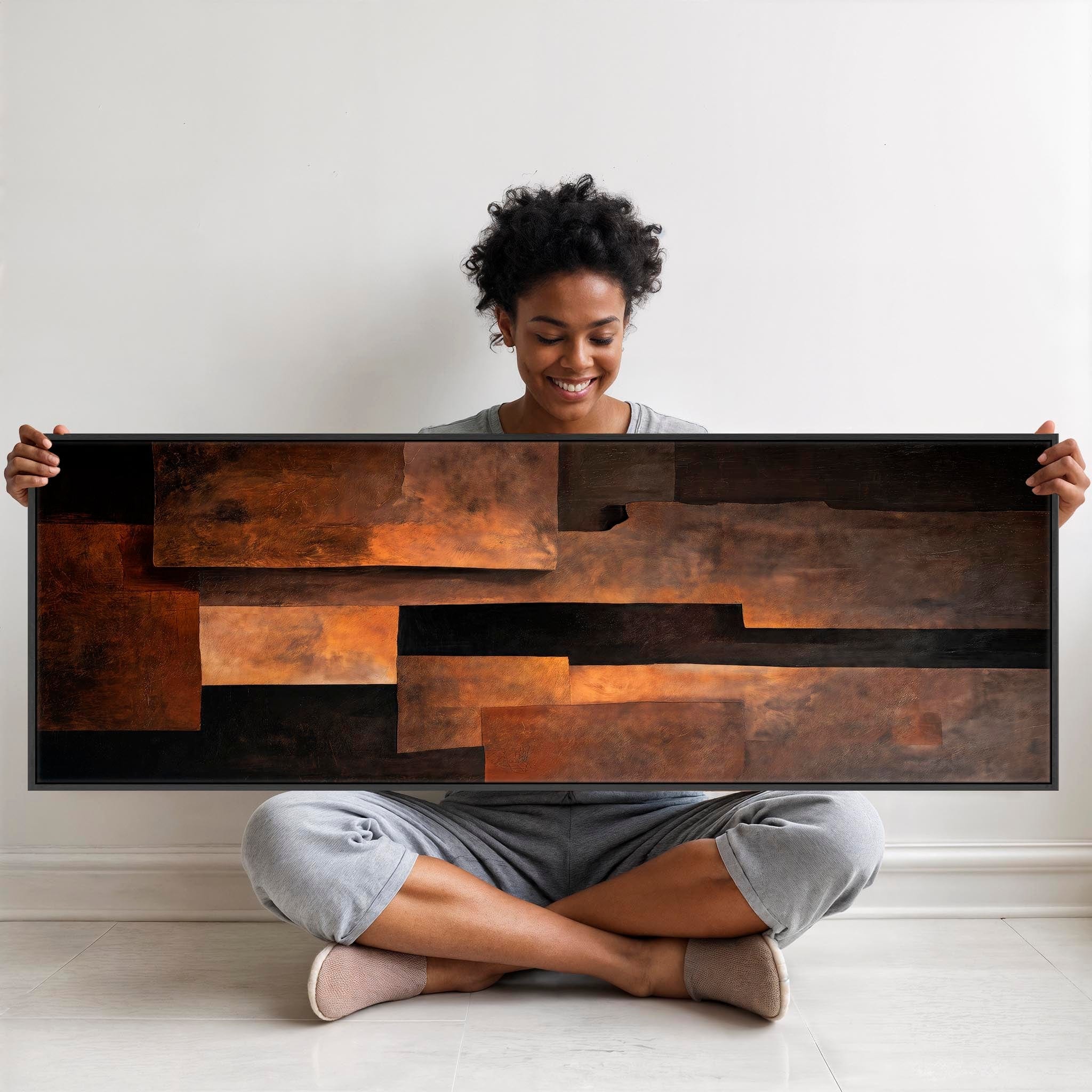 Discover abstract art in rich brown and orange tones with a bold panoramic style, framed in a black frame. Each detail adds depth, transforming your space into a story told through colour, light, and texture.
